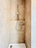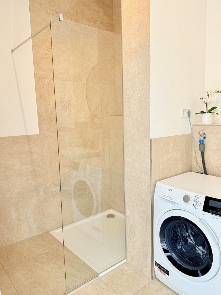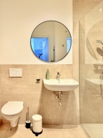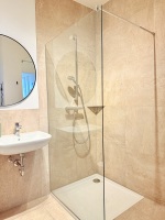 Depending on the apartment, the bedroom features either a large box-spring bed for maximum sleeping comfort or two comfortable single beds. The sofa bed in the living area can be converted into a double bed for additional guests. The stylish bathroom includes a spacious rain shower and comes with towels and a hairdryer.